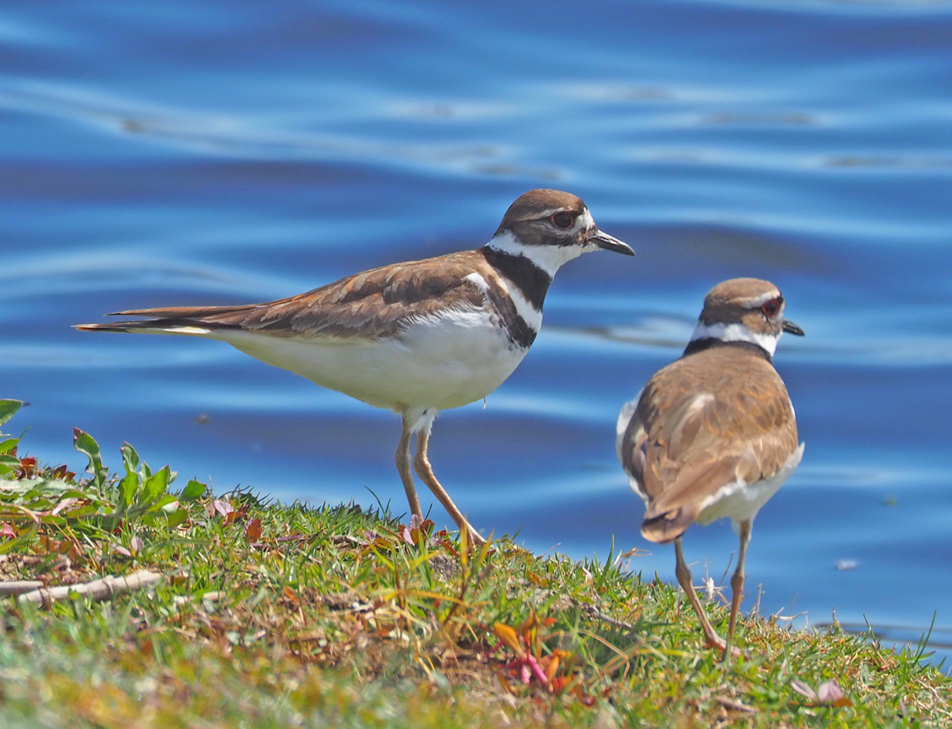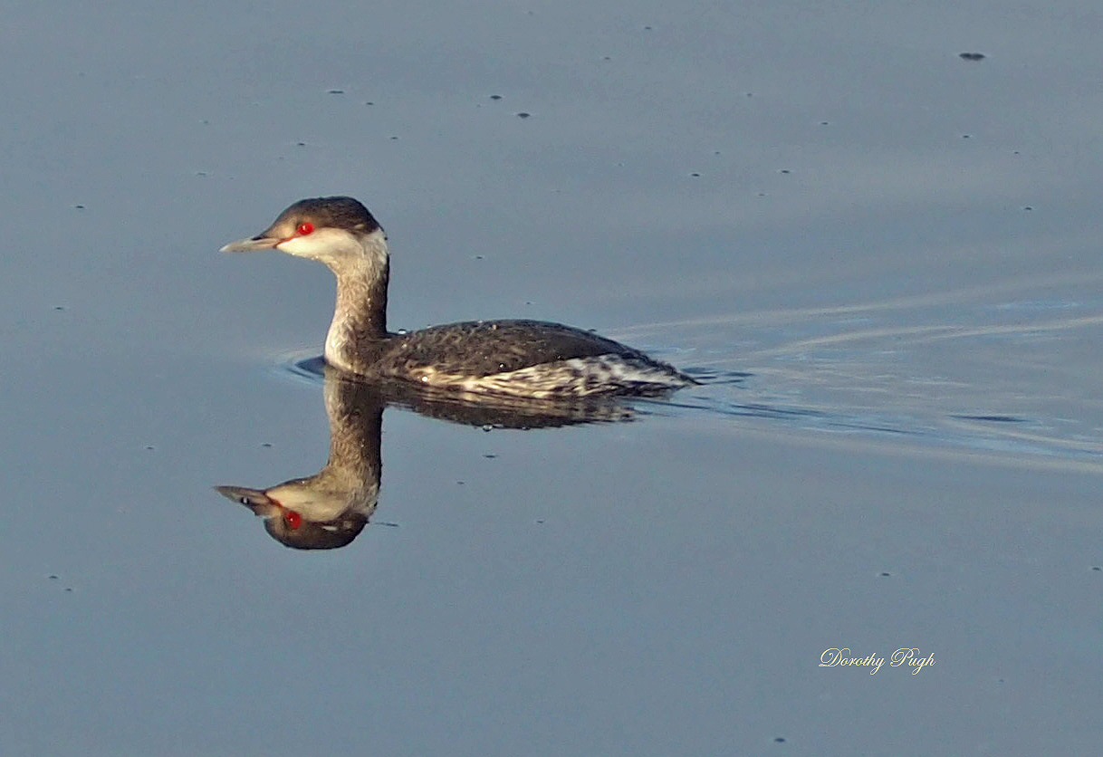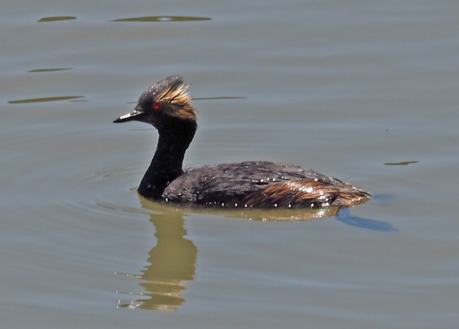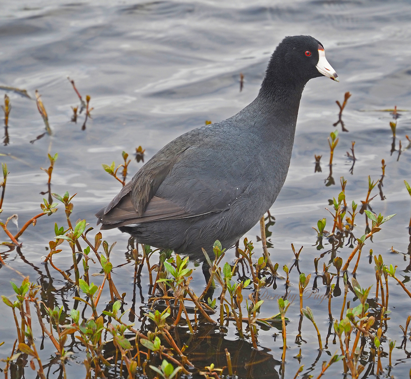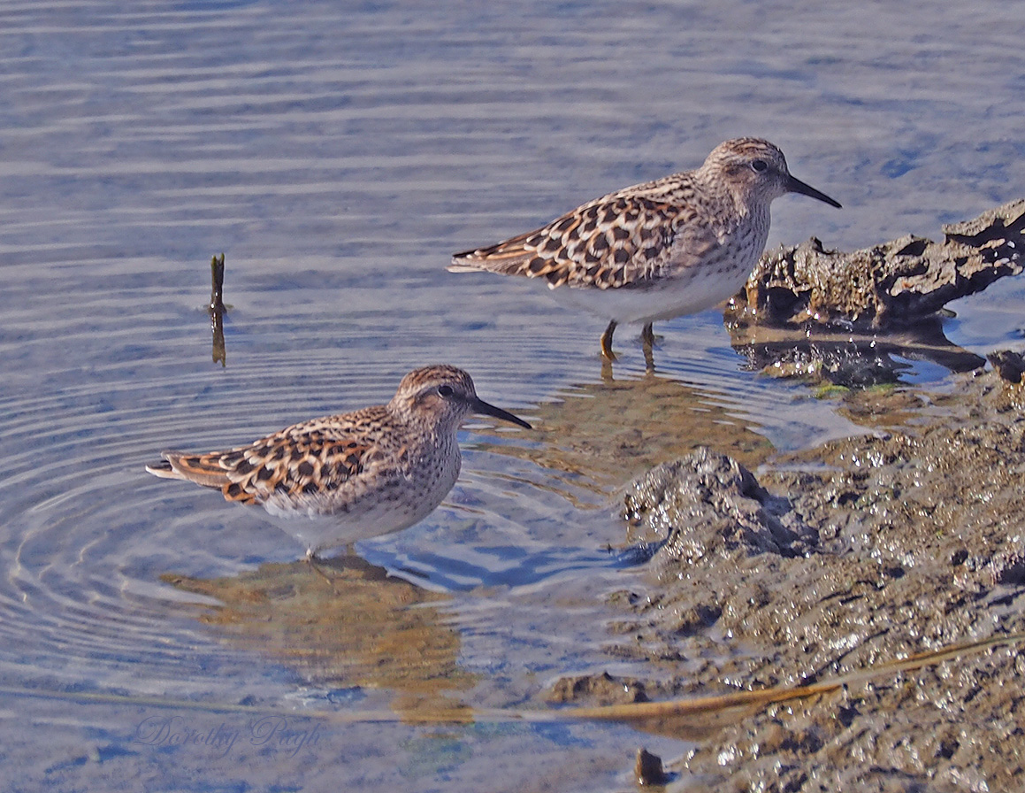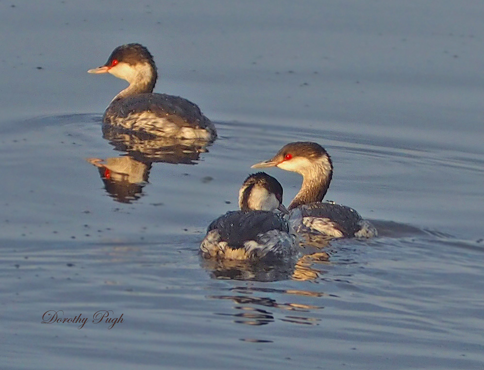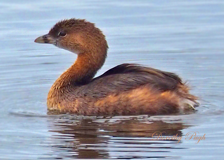 are a few birds in the water, which I'd guess to be Pied-bill Grebes.