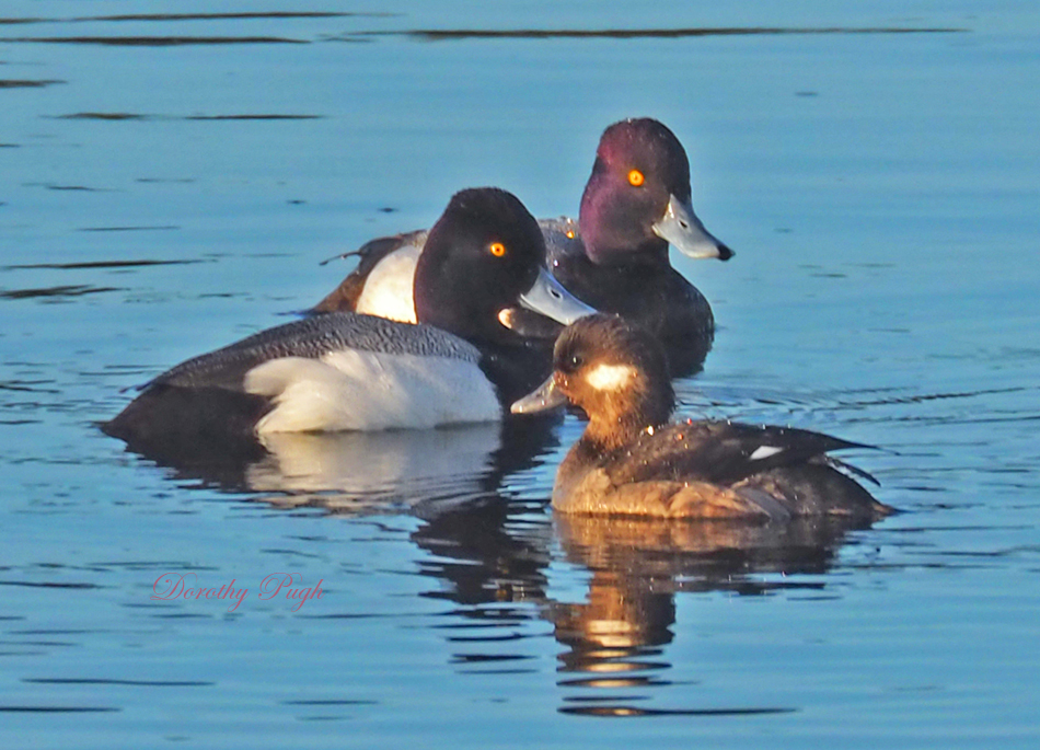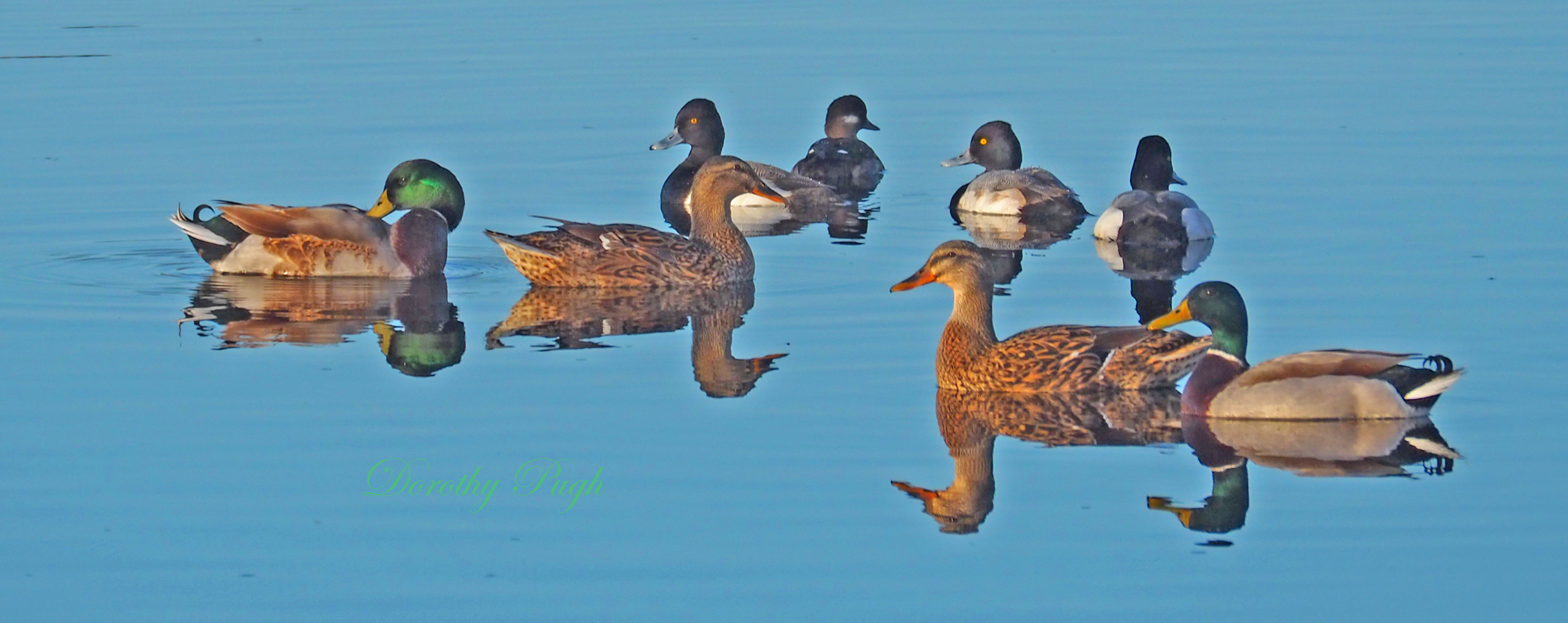 Two Mallard pairs seem to be protecting three male Greater Scaups and a female Bufflehead |