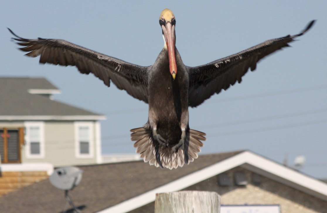 This Brown Pelican came in for a landing, keeping an eye on me the whole time. OK, the last picture was of a different pelican... This was an ideal place for pelicans to catch fish, because the fish were confused by the dead end that the marina created.