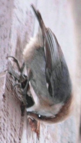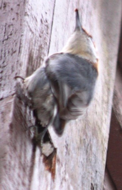 | Brown-headed Nuthatch making a hole in a wooden chimney. This behavior is similar to that of Downy Woodpeckers in this respect, except that Downies can be scared off! | |||||