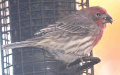 | Young male House Finch | Pine Warbler | Female House Finch | Female Eastern Bluebird | Dark-eyed Junco, seen elsewhere in the neighborhood. |
