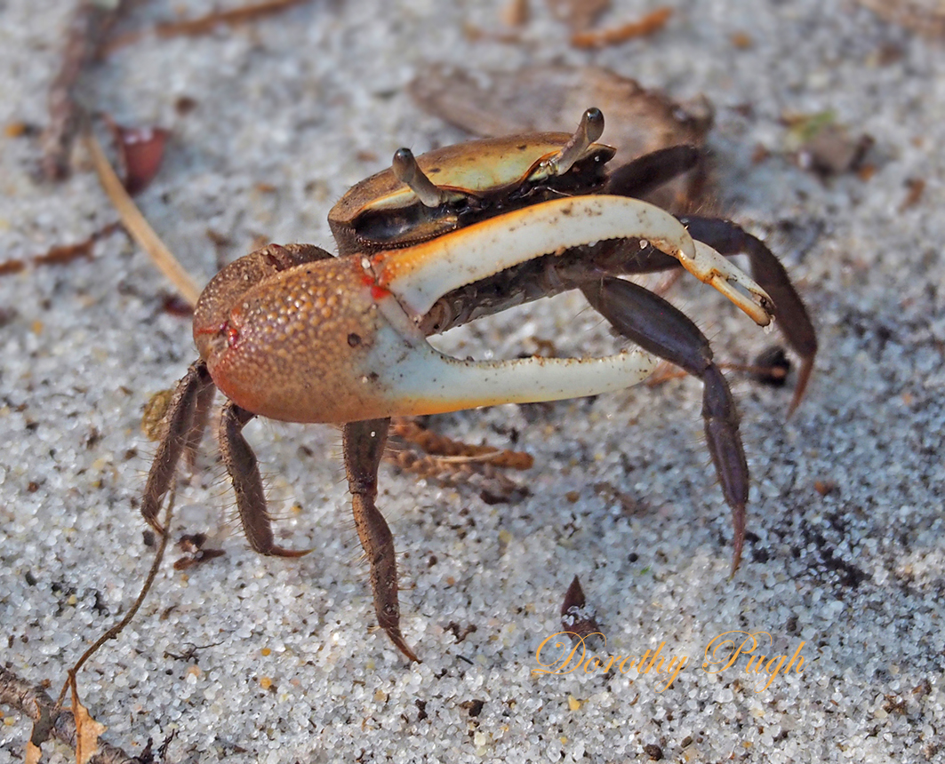 | Female Pileated Woodpecker, one of four of this species seen | One of the several ponds | Sand wasp? | Lone Virginia Spiderwort flower | Wharf Crab |