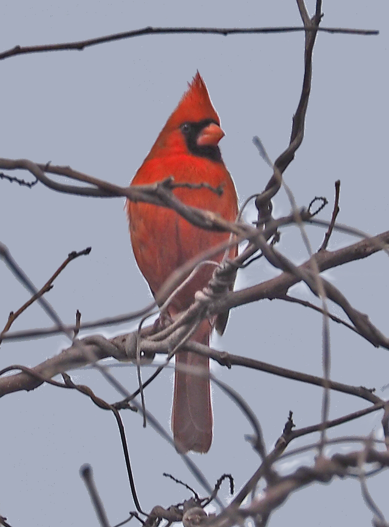 Male Northern Cardinal hiding in a Red Cedar tree |