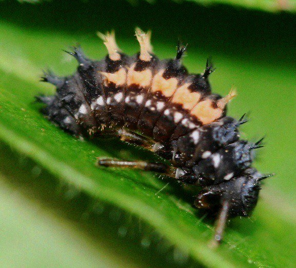 | Asian Multi-colored Ladybug Beetle larva apparently about to become a pupa. | Asian Multi-colored Ladybug Beetle pupa | Aphid | Aphid with what seems to be molted "skin" | A woolly aphid, but a member of a different species from that above. |