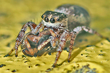 Jumping spider (Paraphidippus aurantius) attacking a young Goldenrod Crab Spider |
