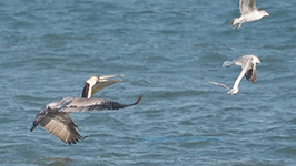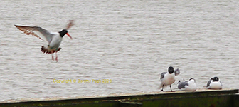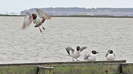 | American Oystercatcher about to depart Laughing Gulls |