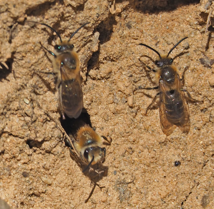 One mining bee is entering a nest, while another is near one and a third is hovering. |
